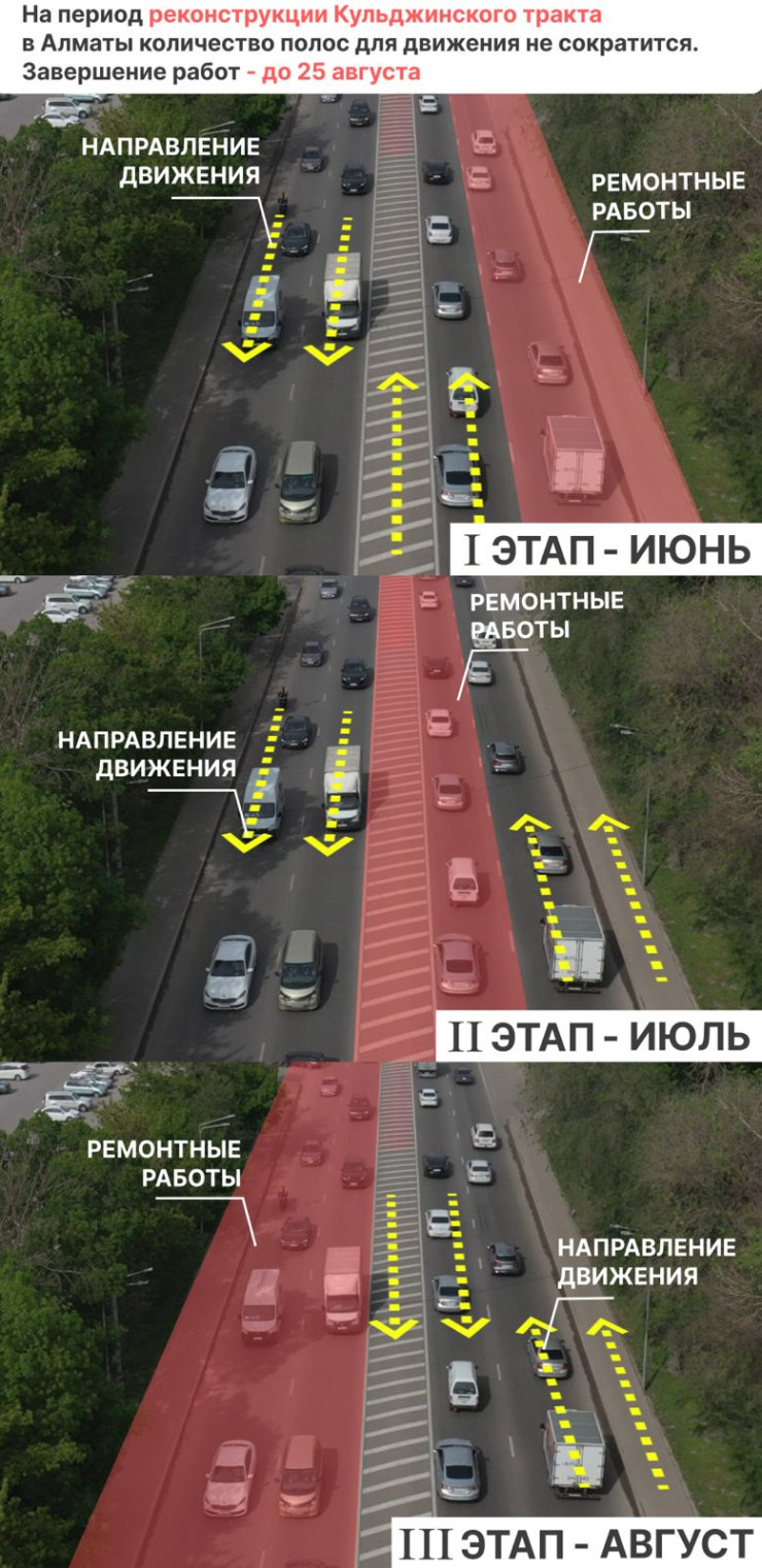 В пресс-службе акимата Алматы сообщили, что с 4 июня начнется реконструкция Кульджинского тракта от проспекта Рыскулова до улицы Бухтарминской. В рамках ремонта планируется расширить ширину проезжей части с четырех до шести полос. Должны реконструировать участок протяженностью 2,3 километра. Будет устроено по три полосы движения в каждую сторону за счет ликвидации разделительной полосы и расширения проезжей части.