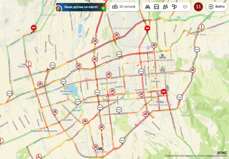 Вечером алматинцы столкнулись с затруднением движения, вызванным сильными осадками. Многие центральные улицы, включая проспекты Аль-Фараби, Абая, Райымбека, Рыскулова, улицы Толе би, Розыбакиева, Сейфулина, Жарокова, Ауэзова и другие, практически не двигаются, а время в пути для водителей увеличилось в несколько раз.