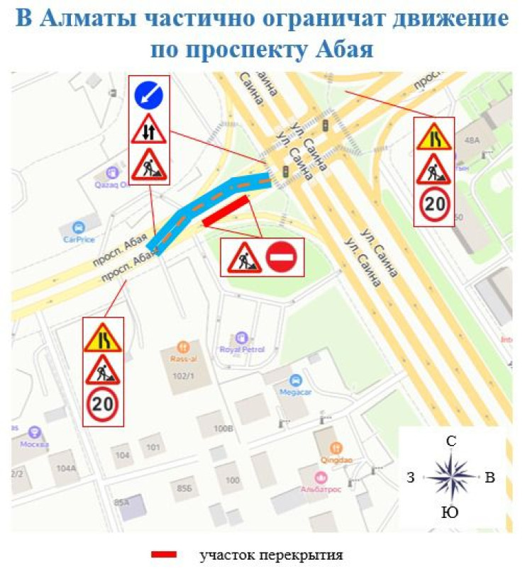 По данным акимата, с 23:00 9 августа до 10:00 12 августа движение автотранспорта в Ауэзовском районе Алматы будет частично ограничено по проспекту Абая от заправки Royal Petrol до улицы Саина в восточном направлении.