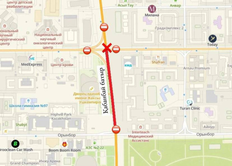 С 21:00 18 июня до 21:00 19 июня вышеуказанный участок будет полностью перекрыт (в том числе перекресток улицы Керей, Жанибек хандар и проспекта Кабанбай батыра).