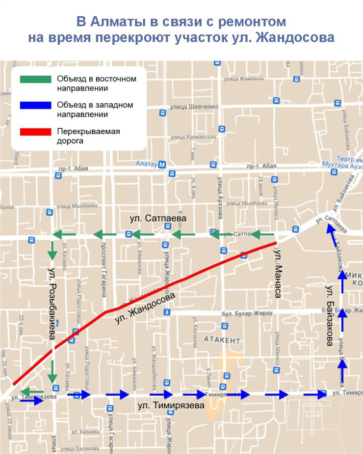 По данным акимата города, с 23:00 3 августа до 11:00 5 августа движение по улице Жандосова будет перекрыто на участке от улицы Тимирязева до улицы Манаса.