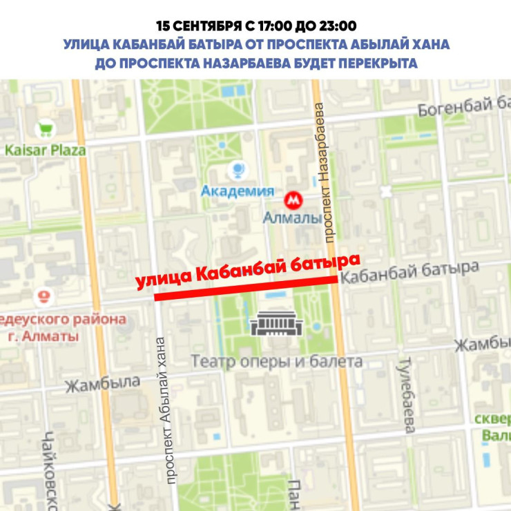 По данным акимата, 15 сентября с 17:00 до 23:00 ожидается перекрытие улицы Кабанбай батыра от проспекта Абылай хана до проспекта Назарбаева в связи с проведением гала-концерта в честь Дня города.
