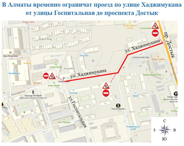 С 09:00 27 июня до 08:00 1 июля 2024 года движение транспорта будет закрыто на участке улицы Хаджимукана от улицы Госпитальной до проспекта Достык. Движение будет перекрыто в обе стороны.