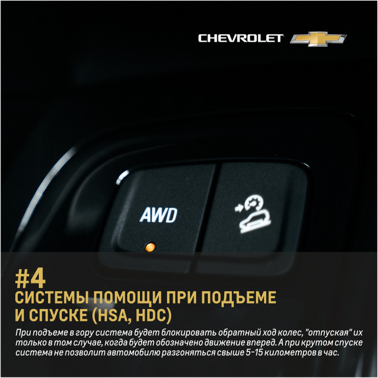 Система помощи при подъеме и спуске называется у разных автопроизводителей по-разному, но самые распространенные аббревиатуры - это HSA и HDC. Данной системой укомплектованы Chevrolet Tracker, Chevrolet Equinox, а также Chevrolet Traverse и Chevrolet Tahoe.