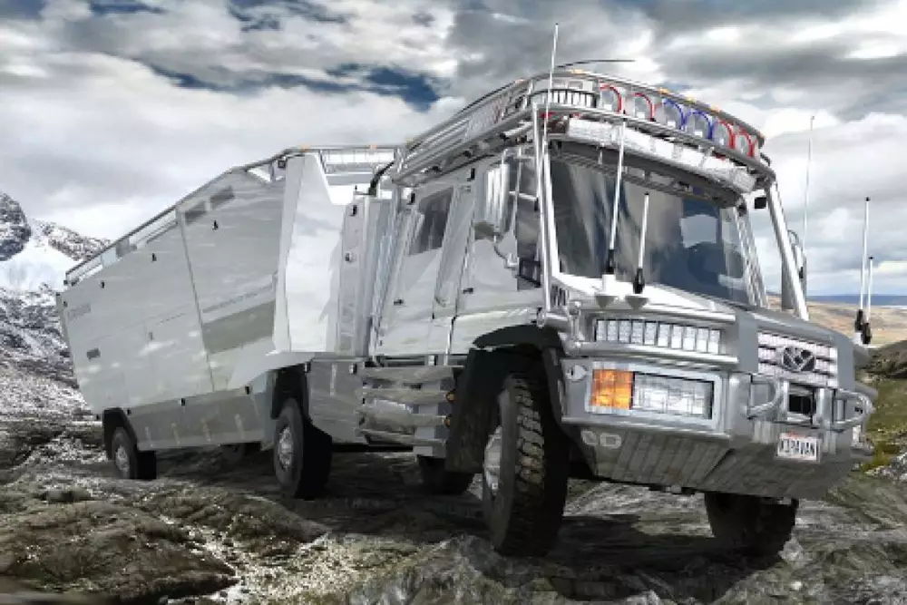 Помимо этого, в доме на колесах для разведки местности есть радиоуправляемые летательные аппараты с камерами и мотоцикл с турбодизельным двигателем. В кузове авто разместились полноценная кухня, спальня для семьи из трех человек и хранилище для провизии на две-три недели. При необходимости совершения более долгих поездок вездеход можно оборудовать дополнительными секциями для хранения продуктов.