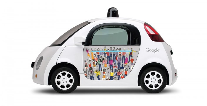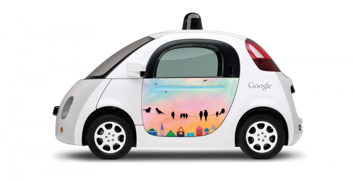 Небольшие автомобили имеют форму полукруга. На дверях самоуправляемых машин появились городские пейзажи, изображения парков, людей, цветов, птиц, аттракционов. Примечательно, что эскизы для аэрографии были выбраны в результате конкурса среди художников Калифорнии. Победители получили по 500 долларов.