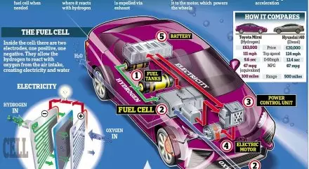 Принцип работы автомобиля будущего следующий: водород смешивается в топливной ячейке с кислородом из воздуха и в результате химической реакции производится электричество, которое используется для электромотора машины. Конечным продуктом такой реакции является вода.