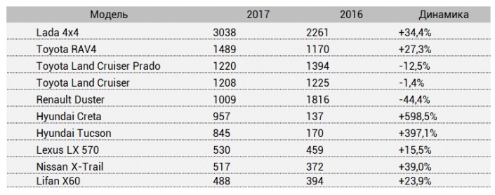 Лидерство в 2017 году продолжает удерживать самый доступный в классе автомобиль – Lada 4x4 с показателем 3 038 внедорожников (+34,4 процента).
