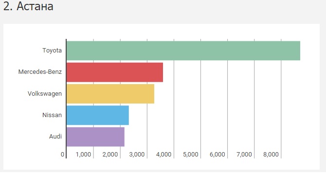 Как и в Алматы, в столице Казахстана, где за весь 2015 год было произведено более 36 тысяч регистраций легковых машин, лидером оказалась Toyota (более 8.7 тысячи). На втором месте по популярности - Mercedes-Benz (почти 3.6 тысячи), а "бронзу" рейтинга взял другой немецкий бренд - Volkswagen (более 3,2 тысячи).