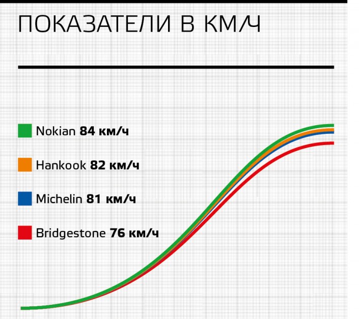 "В затяжном повороте на резине Bridgestone машину может сдвинуть чуть ли не на соседнюю полосу. Едем аккуратнее, соответственно, медленнее. При этом сносы в крутом повороте менее выражены. Hankook воспринимается как более быстрый комплект. Шины издают много шума, сопротивляются, пыхтят, свистят, но держат на мокром покрытии более уверенно. В сносе машиной все еще можно управлять. Michelin демонстрирует черты недостаточной поворачиваемости. Здесь приходится сбрасывать газ чаще, так как скольжение развивается тут на меньшей скорости в сравнении с конкурентами. Также тут приходится по-другому работать с передачами. Там, где Hankook и Nokian позволяют ехать на третьей передаче, на Michelin и Bridgestone приходится спускаться на вторую - скорости не те, моторчик не вывозит. На комплекте Nokian и Hankook автомобиль едет заметно быстрее, это доказывают и результаты испытаний", - рассказал Роман Масленников.