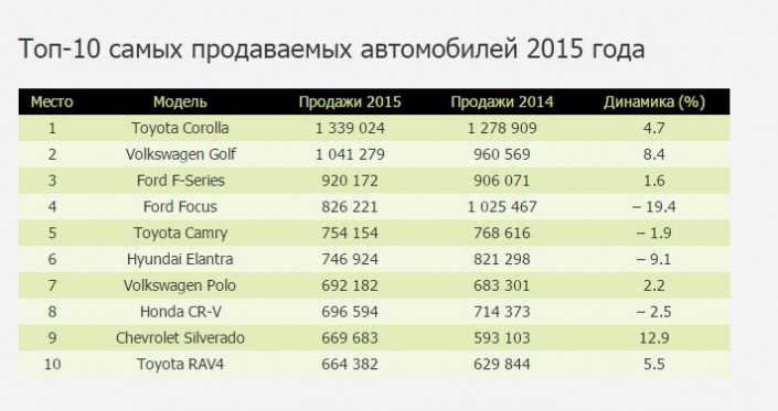 В топ-10 самых популярных автомобилей также попали Ford Focus (826 тысяч), Toyota Camry (754,1 тысяч), Hyundai Elantra (746,9 тысяч), Volkswagen Polo (698,1 тысяч), Honda CR-V (696,6 тысяч), Chevrolet Silverado (669,7 тысяч), а также Toyota RAV4 (664,4 тысяч).