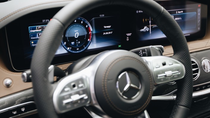 Компания Mercedes-Benz, начиная с 2017 года, окончательно отказывается от старых ключей зажигания. S-класс, впрочем как и все остальные модели, начиная с E-класса, теперь оснащаются цифровым ключом и кнопкой Start/Stop Engine. Существенно изменилось рулевое колесо - оно стало более функционально наполненным. Как и приборная панель. Компания полностью отказалась от технологии SplitView, которая позволяла использовать один дисплей сразу двум людям и под разными углами получать разную картинку. Теперь в S-класс используются два полноценных 31-сантиметровых дисплея, которыми можно управлять прямо с рулевого колеса сенсорными датчиками. Первый экран дает данные с бортового компьютера и всю текущую статистику систем автомобиля, а второй экран можно использовать как для средств навигации, так и для потребления мультимедиа-контента.