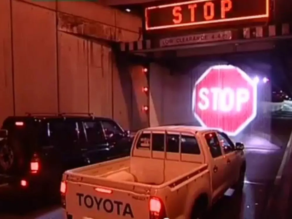 Необычный дорожный знак посредством лазерной установки проецирует на водяной экран необходимое изображение. Революционное устройство находится в автомобильном туннеле, проходящем под гаванью крупнейшего австралийского мегаполиса. Муниципалитет города решил приструнить водителей большегрузов, которые упорно отказывались воспринимать обычные предупреждения на дороге и проезжали по запрещенным полосам в туннель.