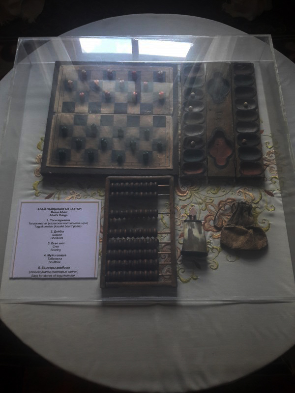 Абай пайдаланған заттар: тоғызқұмалақ, дойбы, есеп шот, мүйіз шақша және былғары дорбаша.