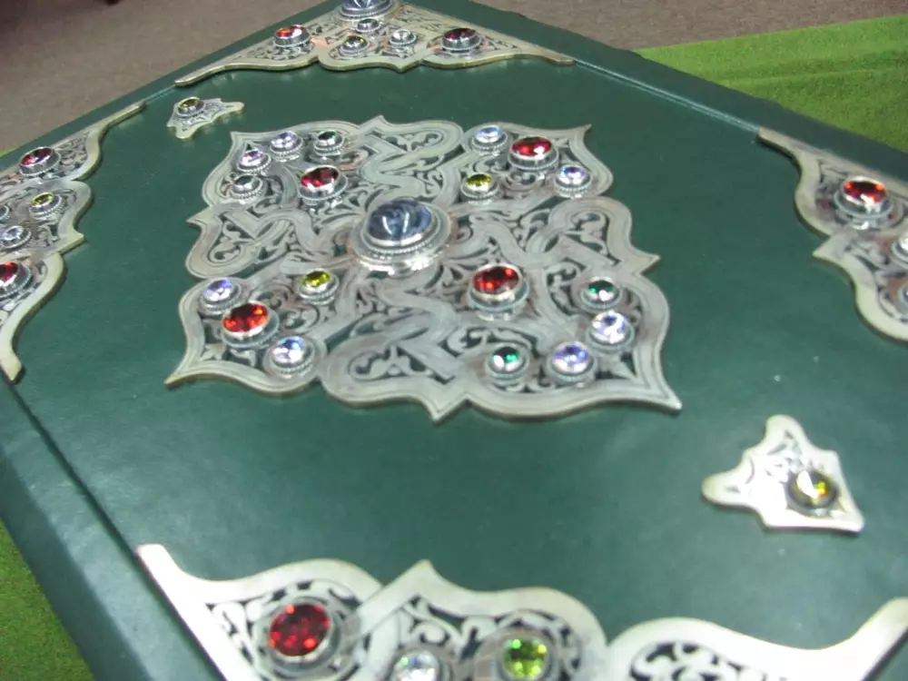 Книга ручной работы. Ее обложку украсили фианиты бриллиантовой огранки и узоры, выполненные из серебра 900 пробы. Текст Корана написан арабской вязью. Бумага выделана вручную, торцы книги посеребренные, натуральный кожаный переплет. Футляр для книги изготовлен из редкого красного дерева.