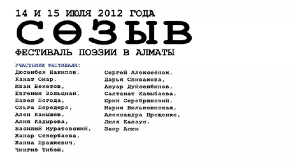 Фестиваль "Сөзыв" проходит в Казахстане впервые. "Мы пригласили авторов из Астаны. Вечер пройдет в неформальной обстановке. Можно послушать произведения, попивая коньяк, - говорит организатор "Сөзыв", поэт Иван Бекетов. - Я побывал в странах постсоветского пространства. В большинстве крупных городов проводятся подобные фестивали, собирающие 150-200 авторов. Пока нам до этого далеко".