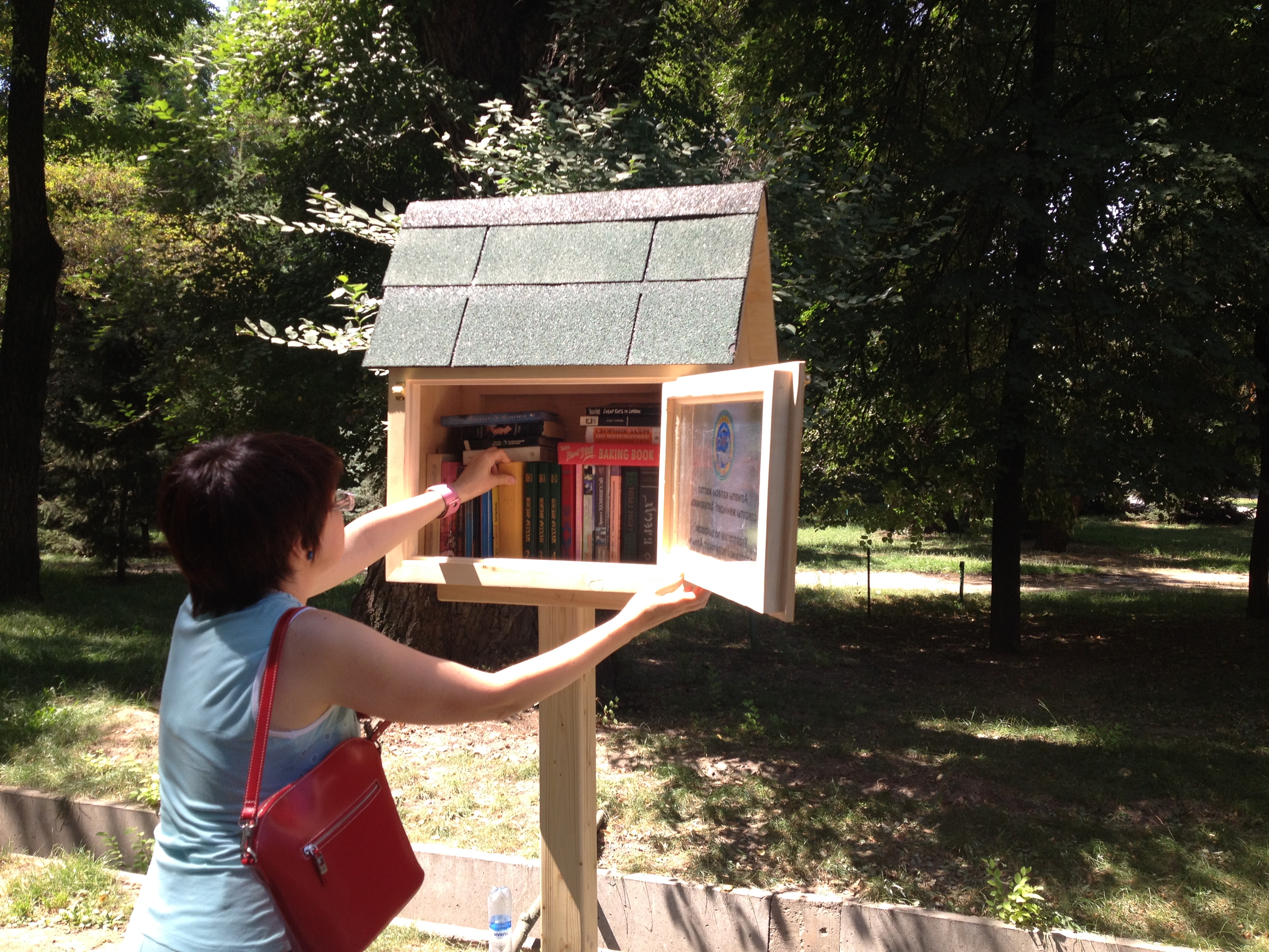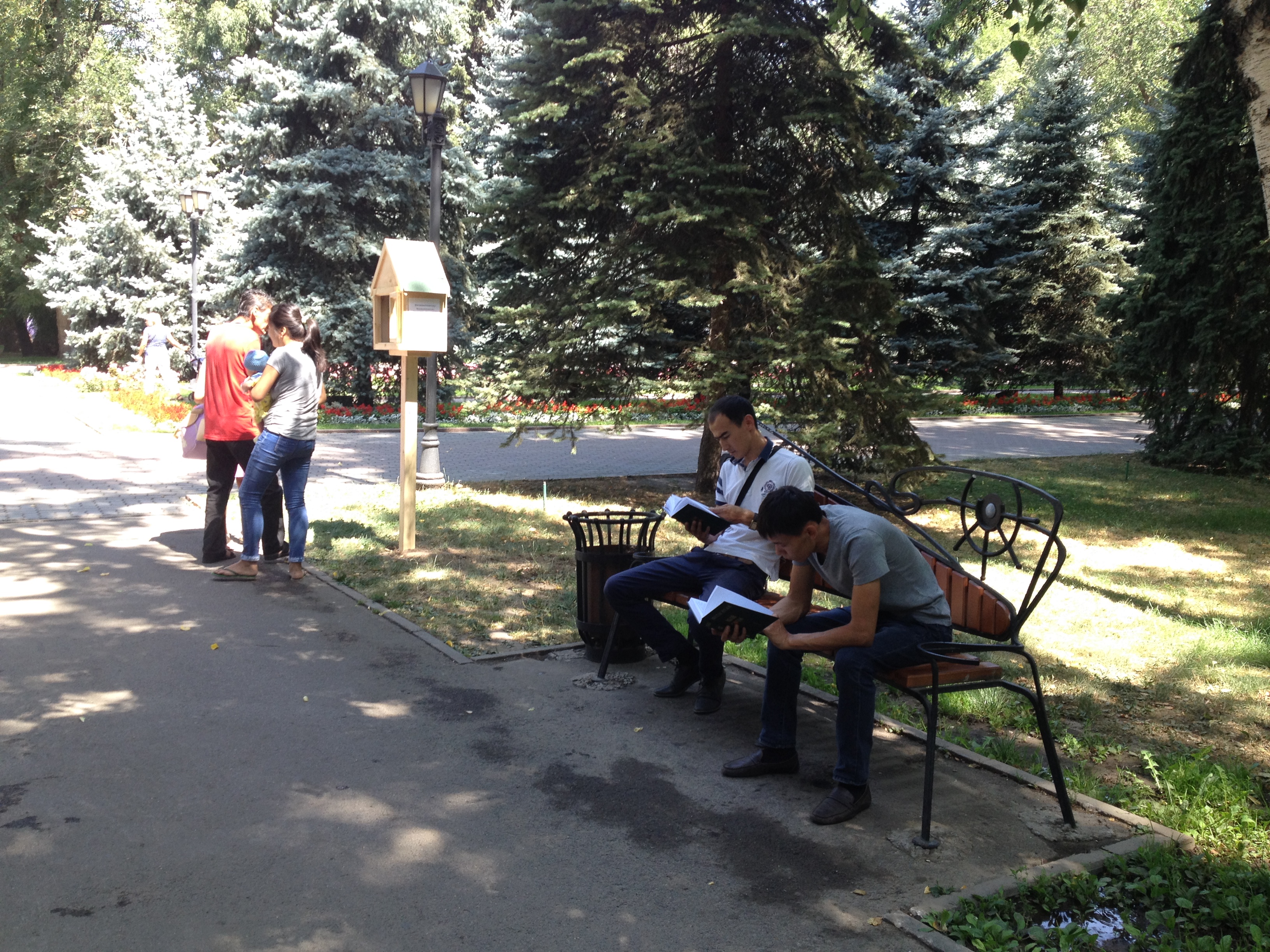 Оригинальный проект нацелен на развитие городской молодежи и повышение культуры в парках Алматы. Рядом со скамейками установлены аккуратные домики в виде скворечников, в которых можно найти книги на трех языках: казахском, русском и английском. Книги самые разные - произведения классиков, зарубежная современная литература, словари и другое. Стоит отметить, что книжные "скворечники" сконструированы герметично, поэтому влага внутрь не проникнет.