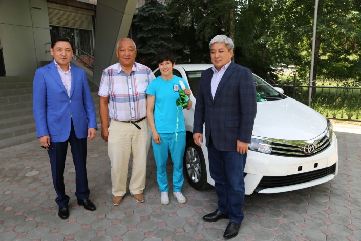 Президент городской федерации по боксу Бакытжан Кажиев подарил девушке новую Toyota Corolla, а ее личному тренеру Жумабеку Омирзакову за подготовку чемпионки вручил денежное вознаграждение.