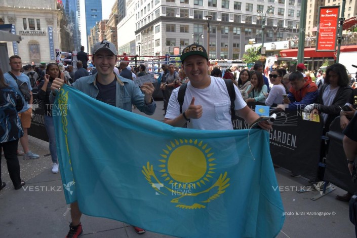 Он пришел с казахстанским флагом на открытую тренировку GGG на арене Madison Square Garden, после чего ему и еще одной болельщице подарили билеты.