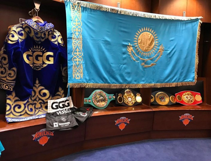 На своей странице в Instagram GGG показал свою раздевалку перед боем. На фото можно видеть флаг Казахстана, традиционный костюм в казахском стиле, в котором боксер выходит на ринг, а также принадлежащие ему пояса (WBC, WBA (Super), IBF и IBO).