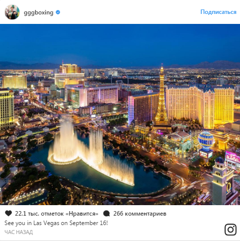 "Увидимся в Лас-Вегасе 16 сентября", - написал Головкин на своей странице в Instagram, выложив фотографию города.