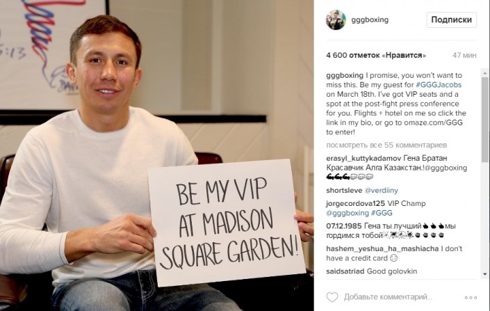 Казахстанский боксер Геннадий Головкин обратился к своим поклонникам перед боем с американцем Дэниэлом Джейкобсом, предложив им VIP-места на поединок, а также перелет и проживание в отеле за его счет.