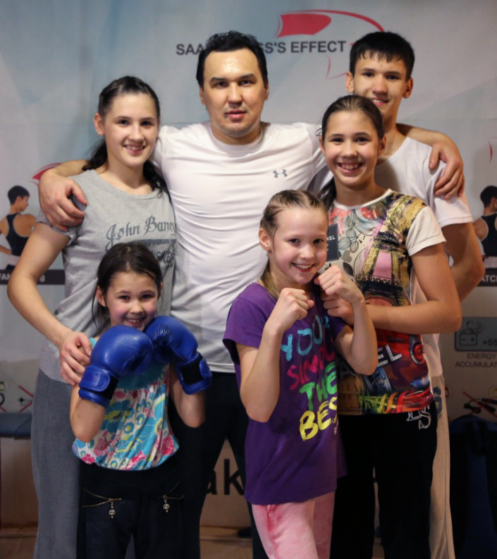 После вечерней тренировки. Слева направо: Анжа самый старший ребенок в семье ей 17 лет, Аделаида в перчатках, Эвника, Сэлявира, и Руш, всех их обнимает папа-тренер Рустам Саадвакасс