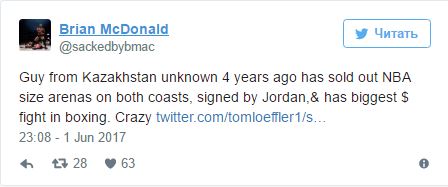 "Парень из Казахстана, которого никто не знал четыре года назад, собрал аншлаги на обоих побережьях на аренах, соизмеримых по размерам с аренами из НБА, подписал контракт с Jordan и получил самый большой и денежный бой в боксе. С ума сойти!" - восхитился Макдональд в "Твиттере", чьим сообщением со своими читателями поделился и промоутер GGG Том Леффлер.