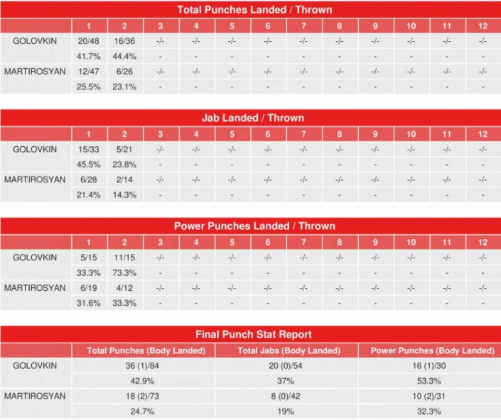 По данным Compubox, за неполных два раунда Головкин выбросил 84 удара, из которых 36 достигли своей цели (43 процента). Соотношение джебов составило 54 к 20 (37 процентов), а силовых ударов - 30 на 16 (53,3 процента).