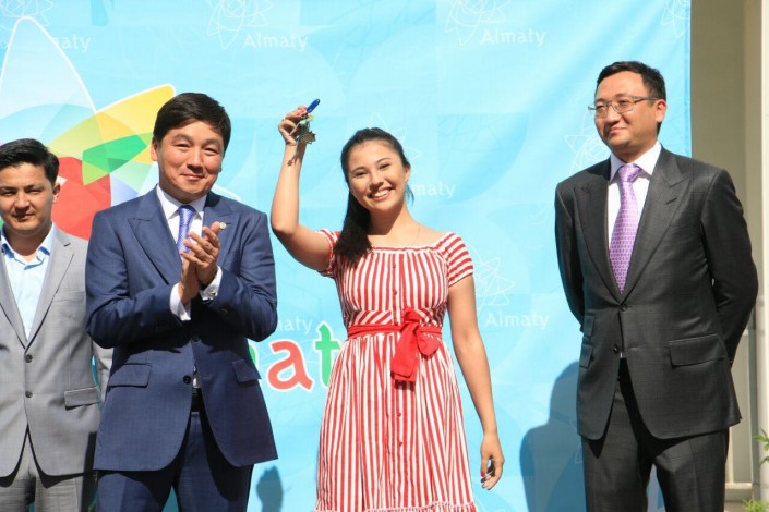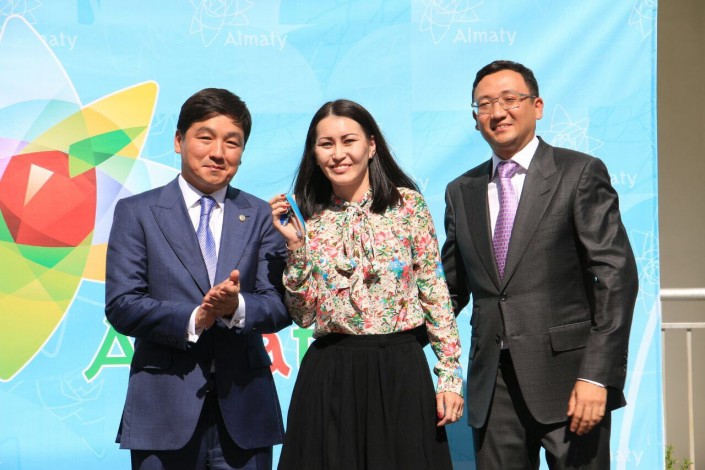 Аким Алматы Бауыржан Байбек и председатель правления АО "Ипотечная Организация" Казахстанская Ипотечная Компания" Адиль Мухамеджанов вручили ключи и сертификаты очередникам на жилье от новых квартир в Атлетической деревне.