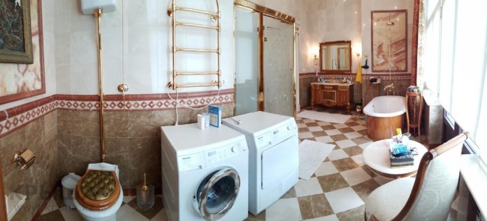 В доме установлены пластиковые окна, имеются навес, баня, гараж, сад и веранда. В каждой спальне имеются собственный санузел и гардеробная. Вместе с домом покупателю достанутся кухонный и спальный гарнитуры, столы, стулья и бытовая техника.