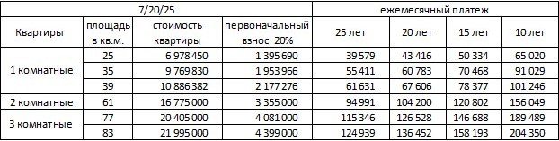В таблице наглядно можно увидеть размеры ежемесячных платежей по всем видам квартир:
