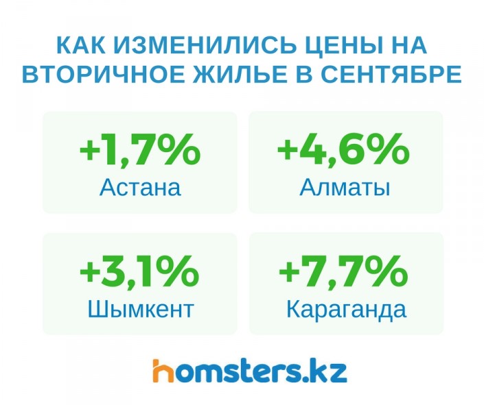 По данным аналитиков, цены на вторичное жилье после нескольких месяцев практически постоянного снижения в сентябре выросли во всех крупных городах Казахстана. Так, старый жилой фонд в начале осени подорожал: в Астане на 1,7 процента, до 325,9 тысячи тенге за квадратный метр, в Алматы на 4,6 процента, до 365,6 тысячи тенге, в Шымкенте на 3,1 процента, до 203,8 тысячи тенге, в Караганде на 7,7 процента, до 194,9 тысячи тенге.