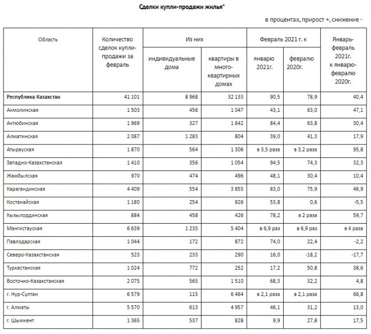 В феврале 2021 года количество зарегистрированных сделок купли-продажи жилья составило 41 101. По сравнению с январем показатель увеличился на 90,5 процента. Об этом говорится в публикации Бюро национальной статистики, передает Tengrinews.kz.
