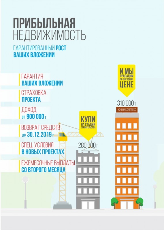 Новая программа для людей, приобретающих жилье для перепродажи. Покупающим квартиру на стадии строительства по низкой цене, компания гарантирует реализацию квартиры после сдачи дома по рыночной. Учитывая риски клиентов, прибыль получаемая от этого вложения будет выплачиваться ежемесячно уже со следующего месяца после приобретения.