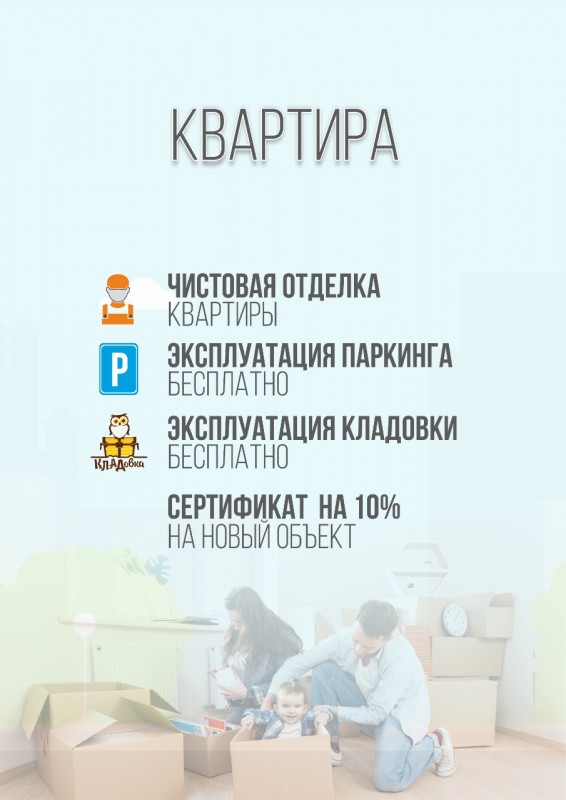 Компания предоставляет беспрецендентные условия, по которым вы покупаете квартиру по цене машины, в чистовой отделке, получаете паркинг и кладовое помещение в эксплуатацию на год бесплатно, с дальнейшей возможностью приобретения. Следующее уникальное условие, предоставляемое компанией: покупая квартиру вы получает сертификат на 10-процентную скидку на покупку следующей.
