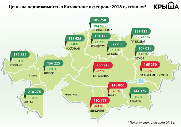 Что касается регионов, то самый заметный, более чем 4-процентный прирост индекса произошел в Семее. В феврале квадратный метр жилья оценивался в среднем в 167 тысяч тенге, тогда как в январе выставлялся на продажу за 160 тысяч тенге. В Актау февральский показатель стал на 1,6 процента выше, чем месяцем ранее. Стоимость жилья в этом городе возросла с 214, 9 до 218, 3 тысячи тенге за квадратный метр.