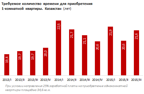 На этом фоне, по их мнению, единственной доступной населению возможностью для приобретения жилья являются программы кредитования через систему жилстройсбережений. "Для покупки однокомнатной квартиры площадью 34,6 квадратных метра среднестатистическому работающему казахстанцу требуется вносить 21 процент от заработной платы в течении 5,5 лет, после чего банк выдает кредит на приобретение квартиры. В последующие 10 лет сумма ежемесячных платежей снизится до 14 процентов от заработной платы. Общая сумма взносов по кредиту составит 109,5 процента от стоимости квартиры", - подытожили эксперты.