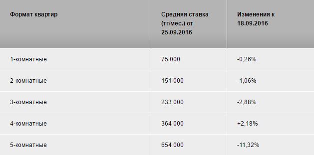 Мониторинг рынка арендного жилья Алматы с 19 по 25 сентября показал, что средняя цена аренды квадратного метра в городе составила 2 155 тенге за квадратный метр. Арендные ставки незначительно изменились на все форматы квартир, в многокомнатном жилье наблюдается снижение цен.