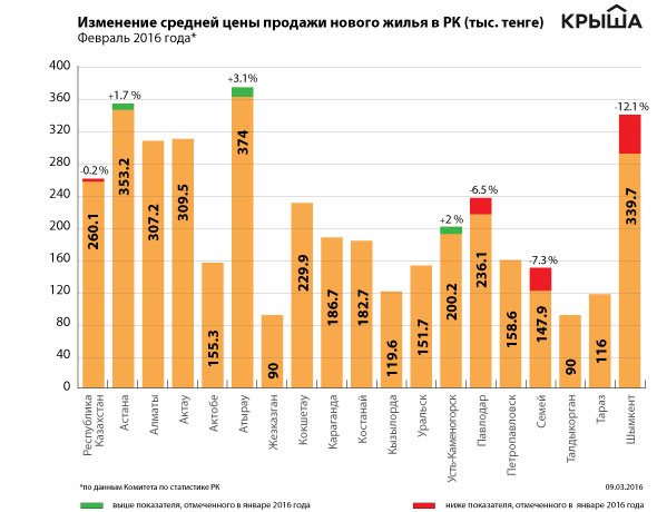 "Максимальное снижение запросов застройщиков зафиксировано в Шымкенте (-12,1 процента), небольшое повышение в Атырау (+3,1 процента). Причем эта тенденция продолжается с начала 2016 года. В Астане также был отмечен рост цен на первичном рынке, здесь аппетиты строительных компаний за месяц выросли на 1,7 процента, до 353,2 тысячи тенге за квадрат. В Алматы цены по сравнению с январем не изменились - застройщики по-прежнему продают новое жилье в среднем за 307,2 тысячи тенге за квадрат. Согласно данным Комитета по статистике, самые дешевые новостройки продаются в Жезказгане и Талдыкоргане - по 90 тысяч тенге за квадратный метр", - пояснили аналитики.