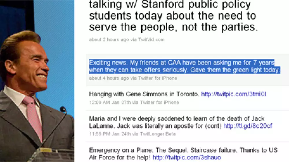 Известный голливудский актер Арнольд Шварценеггер возвращается в кино после семилетнего перерыва, в течение которого находился на посту губернатора американского штата Калифорния. Об этом актер объявил в своем микроблоге в Twitter. "Мои друзья из Креативного актерского агентства CAA (Creative Artists Agency), в течение семи лет задававшие вопрос, когда они смогут сделать деловое предложения, получили "зеленый свет"", - написал Шварценеггер. Отметим, в январе 63-летний актер говорил о том, что уже рассматривает несколько сценариев. Будучи губернатором Калифорнии. Шварценеггер снялся лишь в нескольких эпизодических ролях. Губернаторский срок звезды "Терминатора" завершился 3 января 2011 года с далеко не положительными результатами. Самый населенный штат США находится в состоянии тяжелого экономического кризиса, его тюрьмы переполнены, и даже знаменитые калифорнийские национальные парки вынуждены были перейти на режим повышенной экономии.