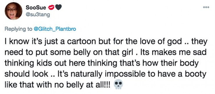 "Да, я отлично понимаю, что это всего лишь мультфильм, но ради бога дорисуйте этой девушке хотя бы живот", - написал один из пользователей.