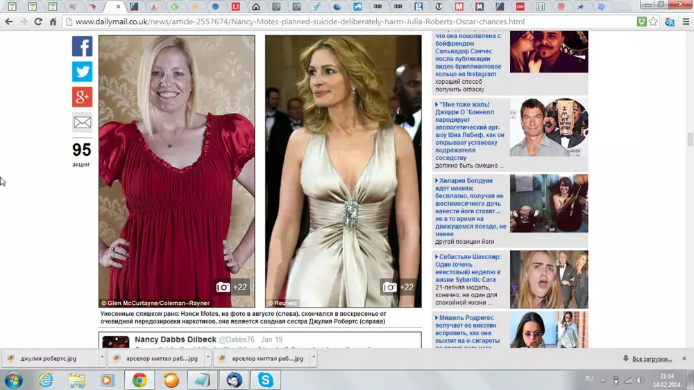 Сводная сестра Джулии Робертс оставила предсмертное письмо, в котором косвенно обвиняет в своей смерти звездную родственницу, передает телеканал Fox News со ссылкой на источники, близкие к расследованию. Напомним, тело 37-летней Нэнси Моутс было найдено в минувшее воскресенье в ванной комнате собственного дома в Лос-Анджелесе. Сообщалось, что женщина совершила самоубийство, приняв большое количество наркотиков. Содержание предсмертной записки официально пока не раскрывается. Однако по данным источников, в своем последнем письме Нэнси обвиняет Джулию в своих бедах и неудачах. Напряженные отношения между сестрами длились много лет. Друзья Нэнси утверждают, что голливудская "Красотка" частенько подшучивала над своей сестрой, которая страдала лишним весом и сильно комплексовала по этому поводу. Отчуждение между ними усилилось, когда Робертс заявила, что не будет присутствовать на свадьбе, которую Нэнси планировала сыграть в мае этого года. По одной из версий, высказанной братом жениха Нэнси, возможно она совершила суицид, чтобы навредить карьере сестры, в этом году претендующей на получение премии "Оскар" за лучшую женскую роль второго плана. Отметим, что в августе 2013 года Нэнси Моутс в одном из интервью призналась, что во время учебы в школе ее более взрослая сестра не раз укоряла ее из-за лишнего веса. "В эти моменты мне было невероятно больно и грустно", - сказала она изданию New York Daily News. Впрочем, окончательная точка в расследовании смерти сводной сестры Джулии Робертс еще не поставлена. В настоящее время проводится экспертиза.