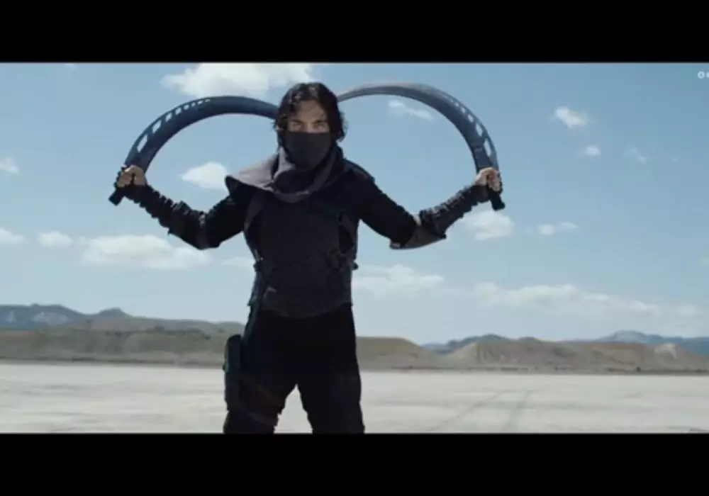 Хан с помощью двух мечей противостоит неким людям в черных костюмах на джипах с пулеметами, перемещаясь между ними, подобно комикс-персонажу Флэшу Гордону. Действо разворачивается посреди пустыни.