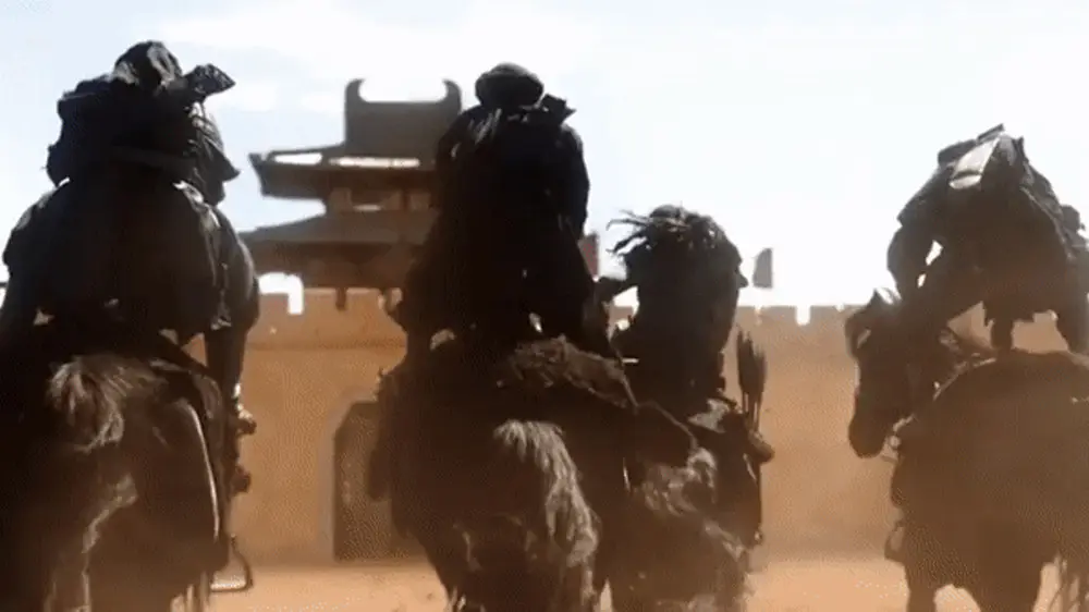 На кадрах видно, как каскадеры стоя скачут на лошадях, стреляют из луков и бегут по стенам. Видеоряд с тренировок переплетается с кадрами из фильма.