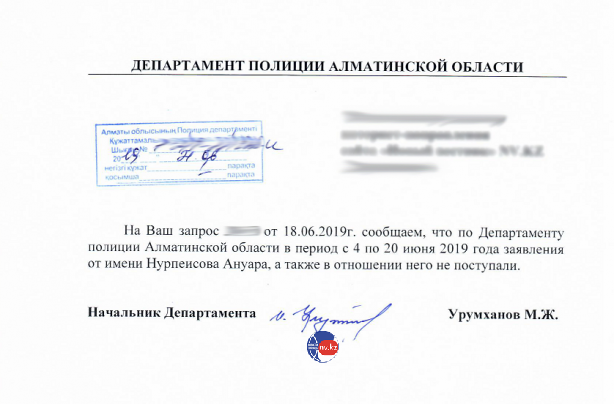 В Департаменте полиции Алматинской области изданию сообщили, что "в период с 4 по 20 июня текущего года заявления от имени Ануара Нурпеисова, а также в отношении него не поступали".