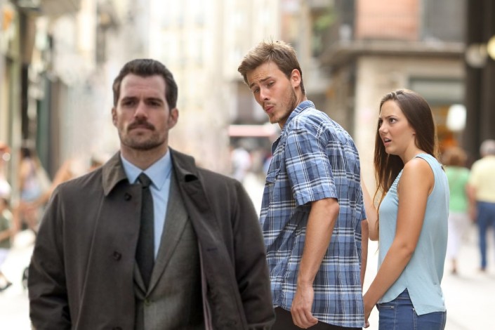 Поклонники знаменитости заметили сходство этого снимка с другим мемом, где один парень, идущий со своей подругой, засматривается на проходящую мимо девушку.