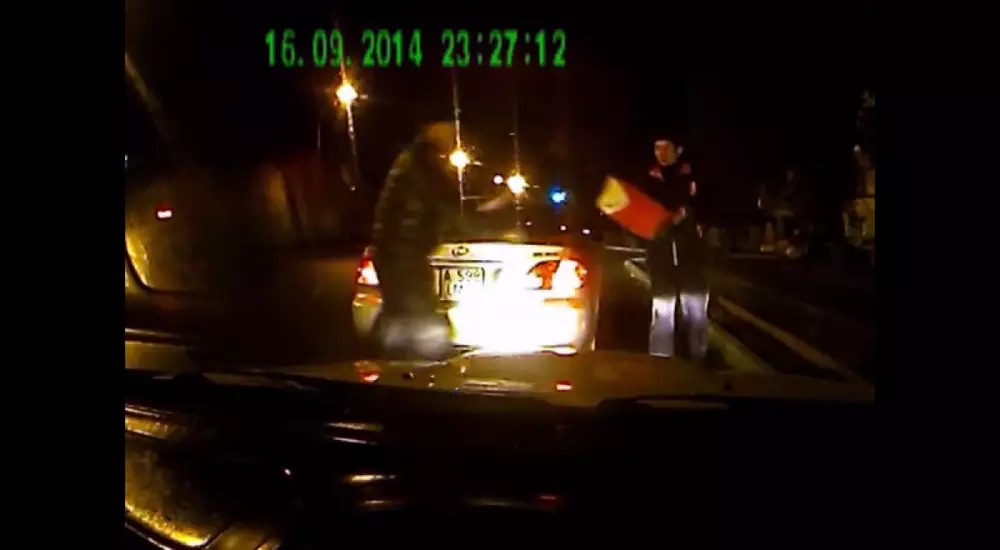 На кадрах видно, как машину, где находятся парень с девушкой, просит остановиться водитель попутного авто. Сначала парень не соглашается, но потом все же тормозит. В свете фар можно рассмотреть номер и марку машины, остановившейся впереди - Lexus с номером А 598 UAO. Затем из машины выходят двое мужчин, один из них просит срочно взять некую сумку и "продержать ее один час". При этом он обещает парню вознаграждение в 20 тысяч долларов. "Встретимся на Абая - Масанчи", - успевает сказать мужчина, затем быстро садится в автомобиль и уезжает.