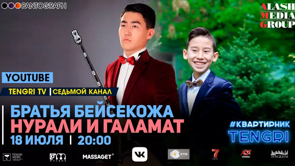 Медиахолдинг Alash Media Group совместно с продюсерским центром Pantograph продолжает серию онлайн-концертов #КвартирникTengri. Концерт братьев - музыкантов и композиторов Нурали и Галамата Бейсекожа пройдет в эфире YouTube-канала Tengri TV сегодня, 18 июля, в 20.00.