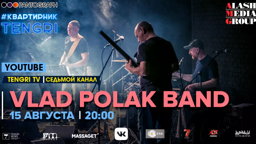 Медиахолдинг Alash Media Group совместно с продюсерским центром Pantograph продолжает серию онлайн-концертов #КвартирникTengri. Концерт группы VLAD POLAK BAND пройдет в эфире YouTube-канала Tengri TV сегодня, 15 августа, в 20.00.